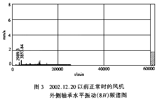 2.對照故障前后風(fēng)機(jī)外側(cè)軸承水平振動頻譜圖3和圖4,可以看出圖中有兩個較大的峰值,其特征頻率分別為3853r/min和2989r/min。前者為風(fēng)機(jī)轉(zhuǎn)速,后者為電機(jī)轉(zhuǎn)速。正常時(圖3),風(fēng)機(jī)的振動水平大于電機(jī)。而故障時(圖4),電機(jī)振動水平不但遠(yuǎn)遠(yuǎn)大于正常時的水平,而且也遠(yuǎn)遠(yuǎn)大于風(fēng)機(jī)水平。因此初步判斷振動原因在電動機(jī)及低速齒輪軸部分。